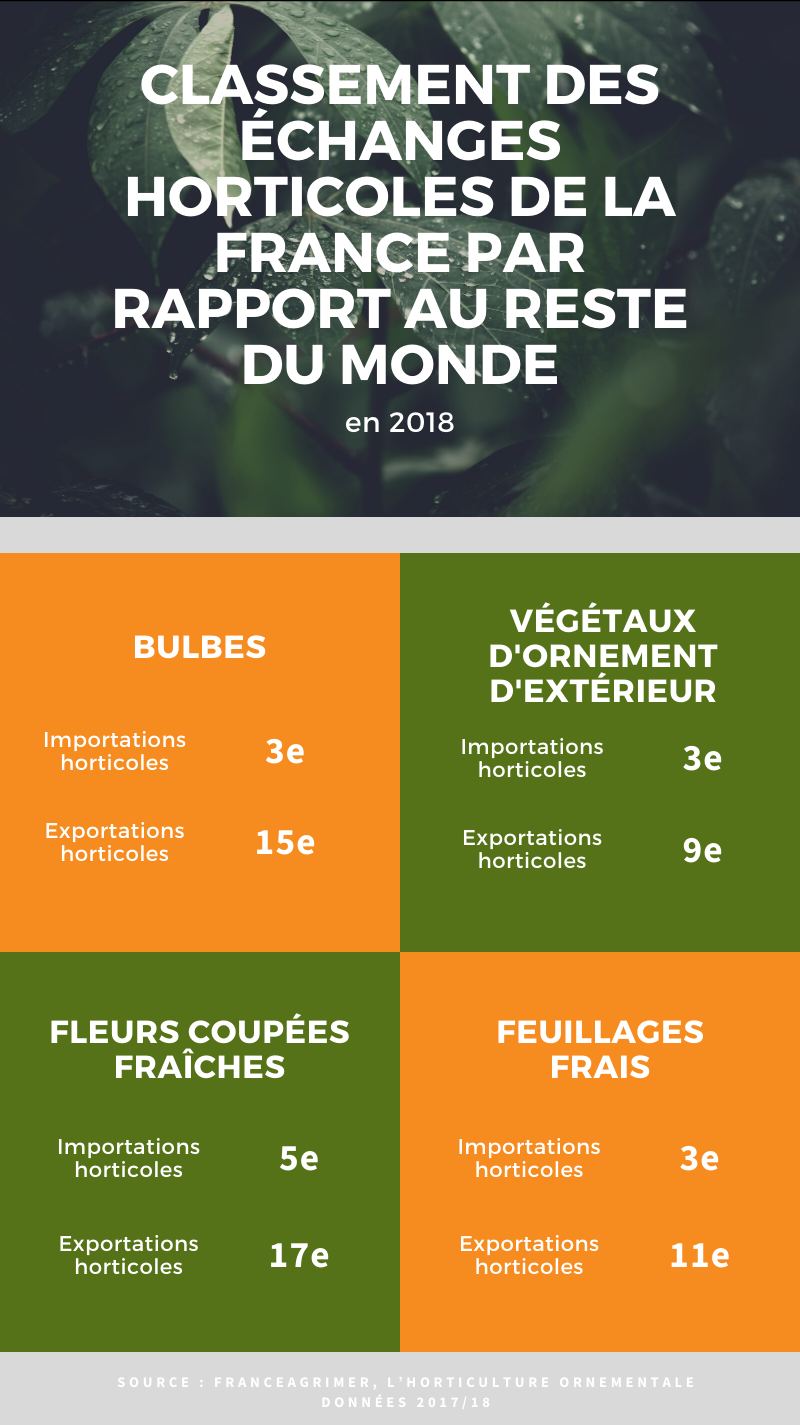 Bonne cliente, la France importait en 2018 près de 14 fois ce qu'elle exportait en termes de valeur ! Ainsi, le secteur horticole comptabilise 926 millions d'euros de produits importés, contre 68 millions en exportation. L'export est cependant en hausse, avec + 14 % par rapport à l'année précédente.